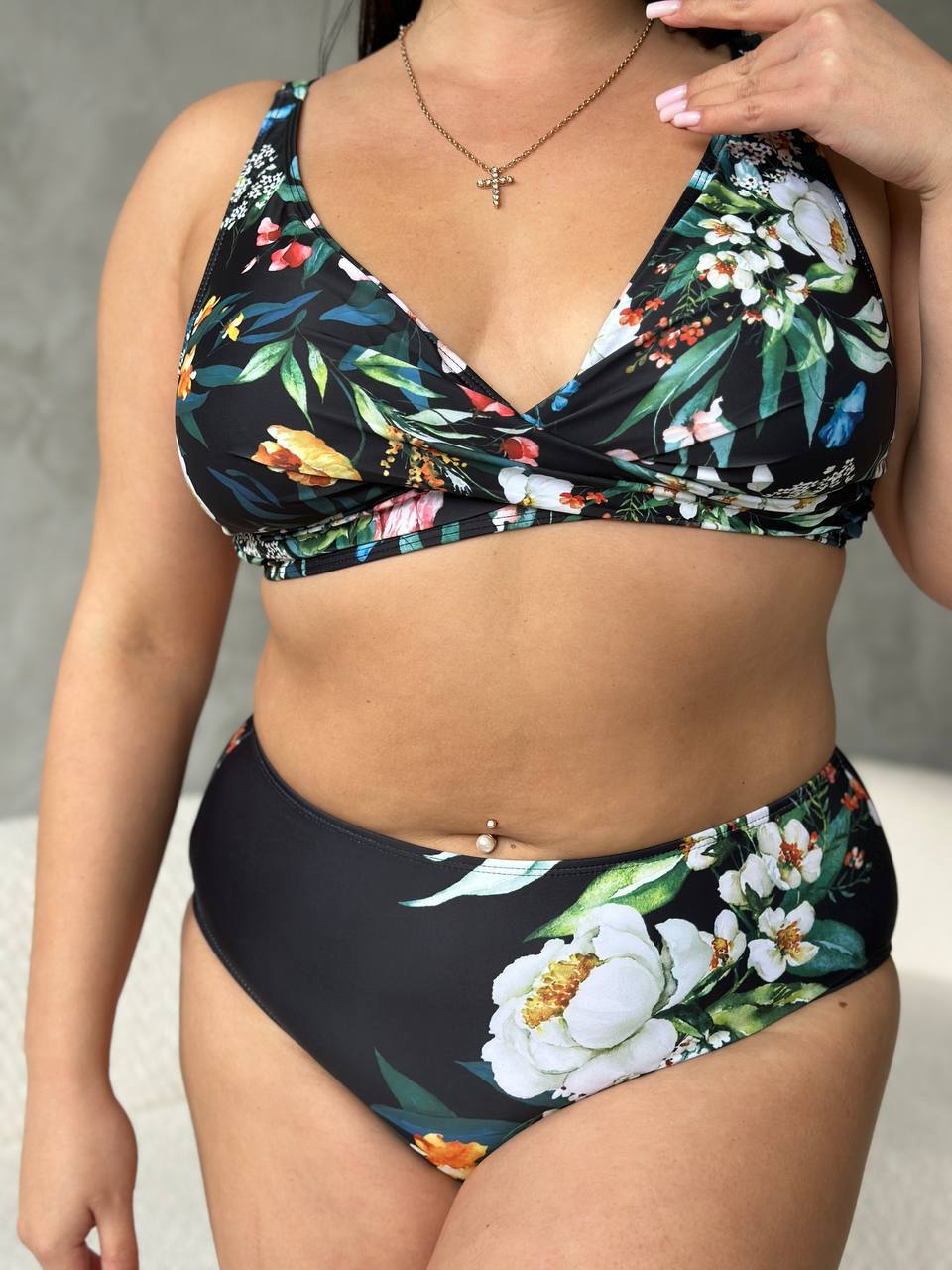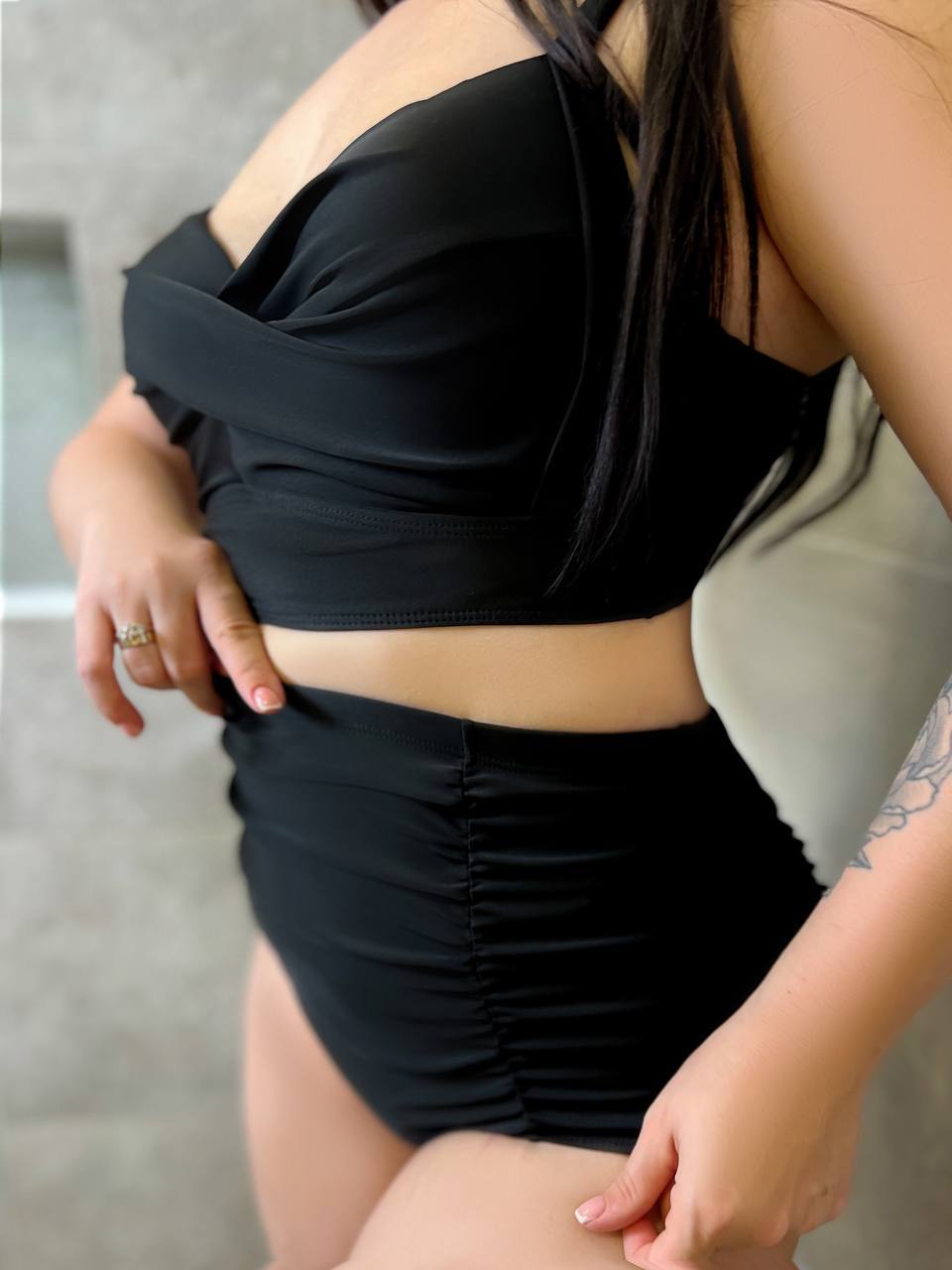 ✔️ Верх із V-подібним вирізом і запахом — візуально подовжує шию й гарно тримає форму грудей
